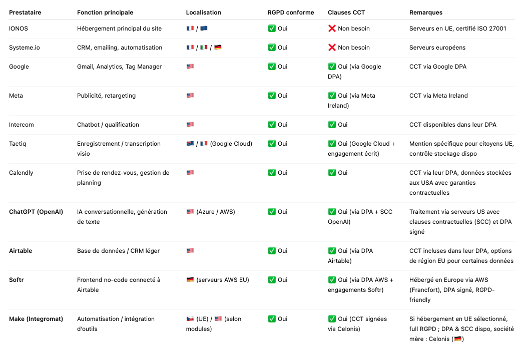 Nous utilisons certains services tiers pour opérer notre site, tous conformes au RGPD ou signataires des Clauses Contractuelles Types (CCT) de la Commission européenne :